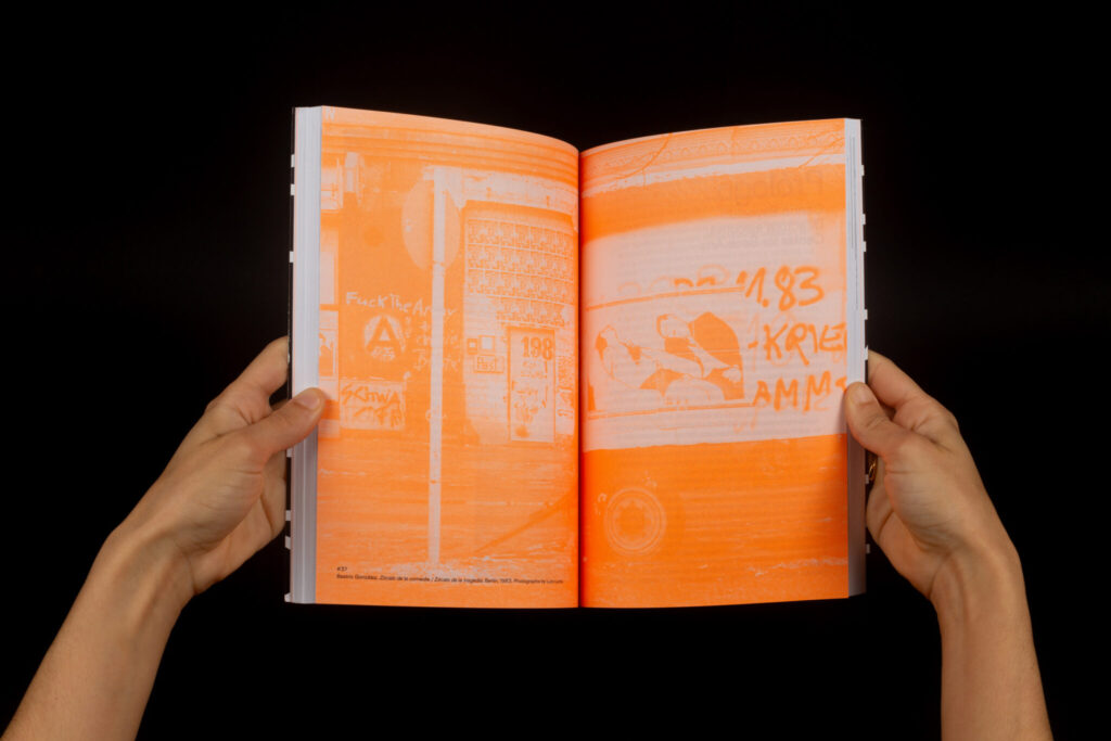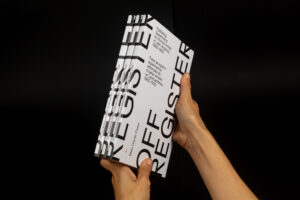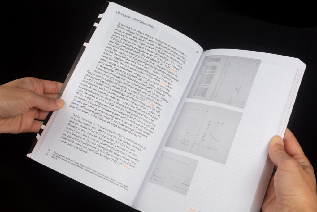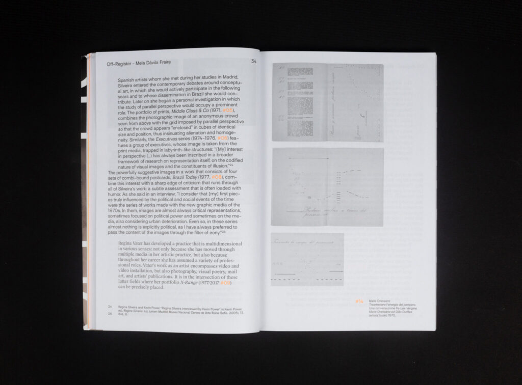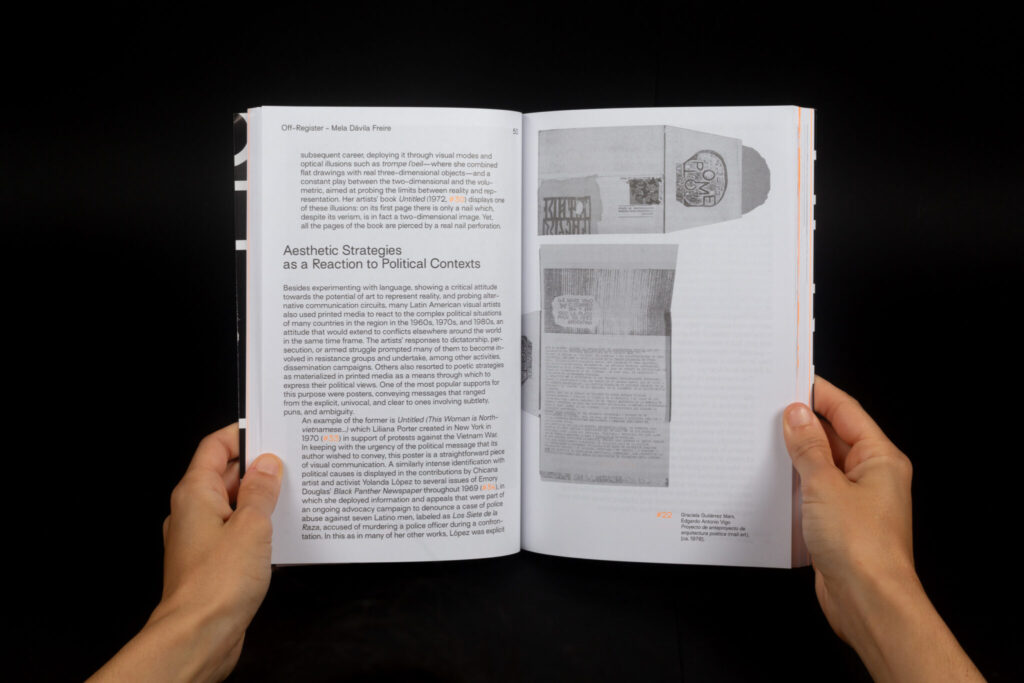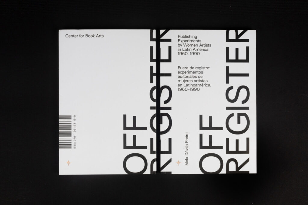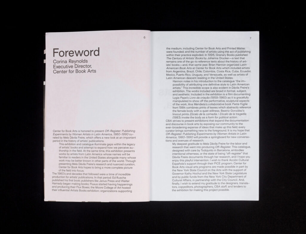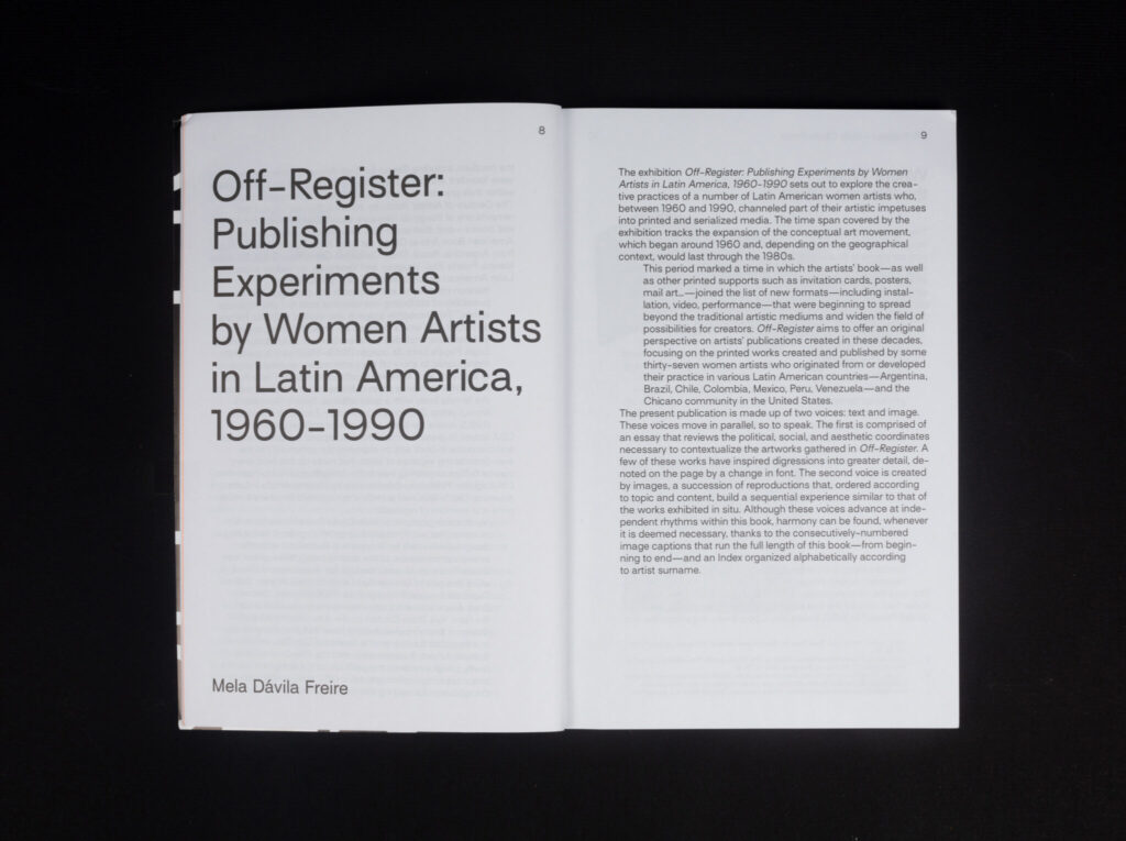 «La presente publicación, que aparece con motivo de la exposición [del mismo título], se compone de dos voces que, por así decir, avanzan en paralelo. La primera de estas voces es un ensayo en el que se repasan las coordenadas políticas, sociales y estéticas relevantes para situar las obras reunidas en Fuera de registro. Muchas de estas obras se comentan, además, con cierto detalle, algunas en el texto corrido y otras en digresiones diferenciadas por un cambio tipográfico. La segunda es una sucesión de reproducciones, ordenadas de acuerdo a cuestiones temáticas y de contenido, que construyen en las páginas derechas una secuencia semejante a la de las obras expuestas en la sede del Center for Book Arts. Aunque ambas voces —texto e imágenes— avanzan a ritmos independientes, es posible relacionar mutuamente su contenido, allí donde se considere necesario, merced a la numeración consecutiva de las reproducciones.»