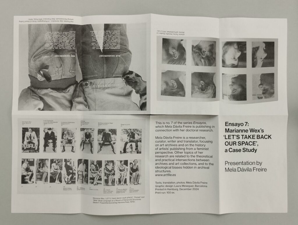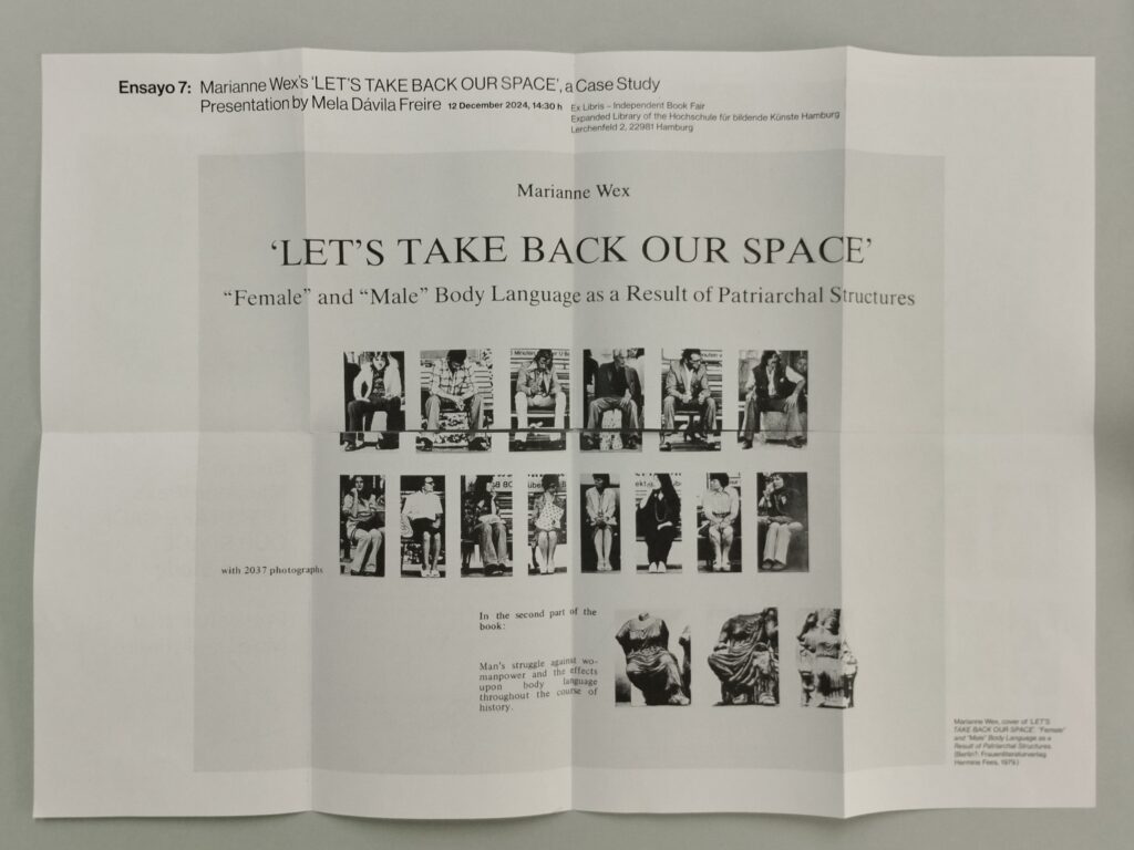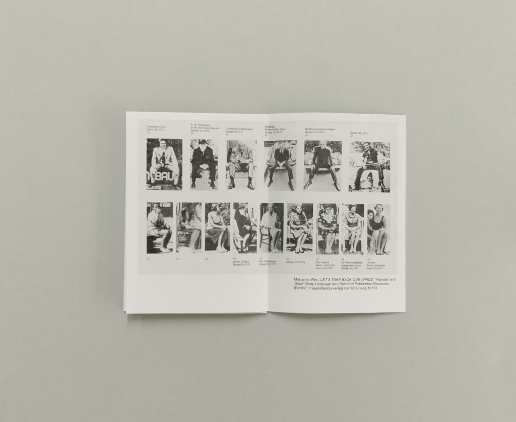 The German artist Marianne Wex earned a degree in Fine Arts and subsequently taught typography for several years at the Hamburg University of Fine Arts (HfbK). Her best-known work, the research project and book Let’s Get Back Our Space – ‘Female’ and ‘Male’ Body Language as a Result of Patriarchal Structures (Frauenliteraturverlag Hemine Fees, 1979), is in fact her final thesis project. For this reason, I thought it appropriate to choose this project as the topic for a talk in the context of the first edition of Ex Libris – Independent Book Fair, which took place at the School’s Expanded Library.