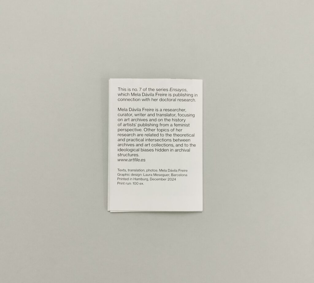 The Ensayos series was launched in late 2021, coinciding with the start of a wide-ranging research project aimed at redefining—from a feminist and, to the extent possible, decolonial perspective—the canon that historiography has established for the artist’s book genre. The aim of this series is to present partial research findings in a variety of printed formats. While disseminating information and content, the publications in the series experiment with alternative formats to the channels through which academic research is usually disseminated.